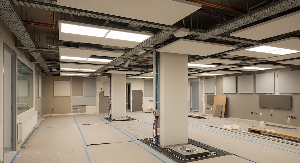 • Techos: Los falsos techos acústicos son una solución común. Incorporan materiales absorbentes (como paneles de fibra mineral o techos suspendidos) que evitan la reverberación y reducen la transmisión del sonido a la planta superior.