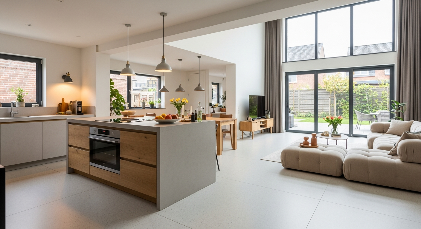 La distribución es el esqueleto de tu hogar. Las tendencias actuales apuestan por los espacios abiertos y diáfanos, y por una buena razón. Eliminar tabiques para unificar la cocina, el salón y el comedor no solo crea una mayor sensación de amplitud, sino que también fomenta la convivencia y permite que la luz natural fluya sin obstáculos por toda la planta. Este concepto, conocido como open concept, es uno de los pilares para modernizar una casa, haciéndola más sociable y versátil.