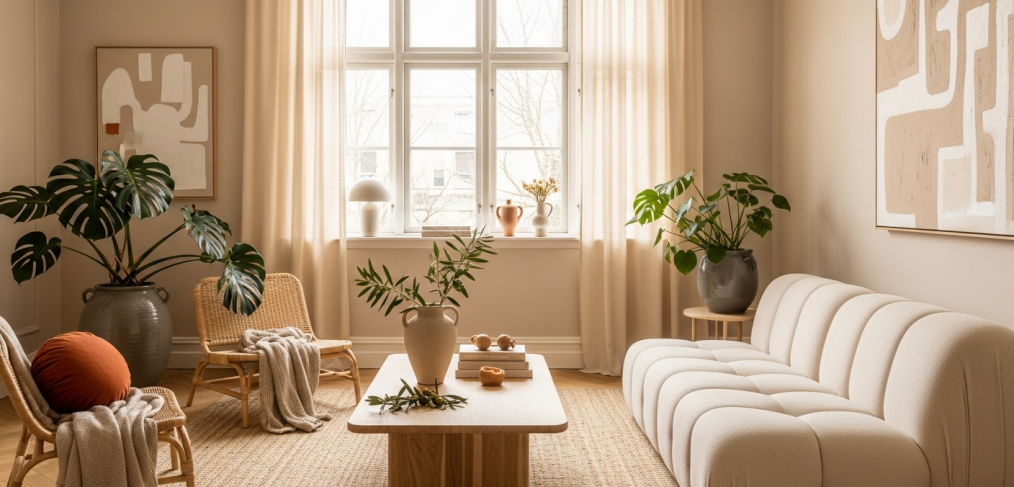 Tu punto de partida debe ser una base clara y relajante. Estos colores no solo aportan sofisticación y amplitud visual, sino que también actúan como el fondo perfecto para los elementos más característicos del estilo. Los colores de acento se usan con moderación, aportando toques de calidez y personalidad sin romper la armonía general.