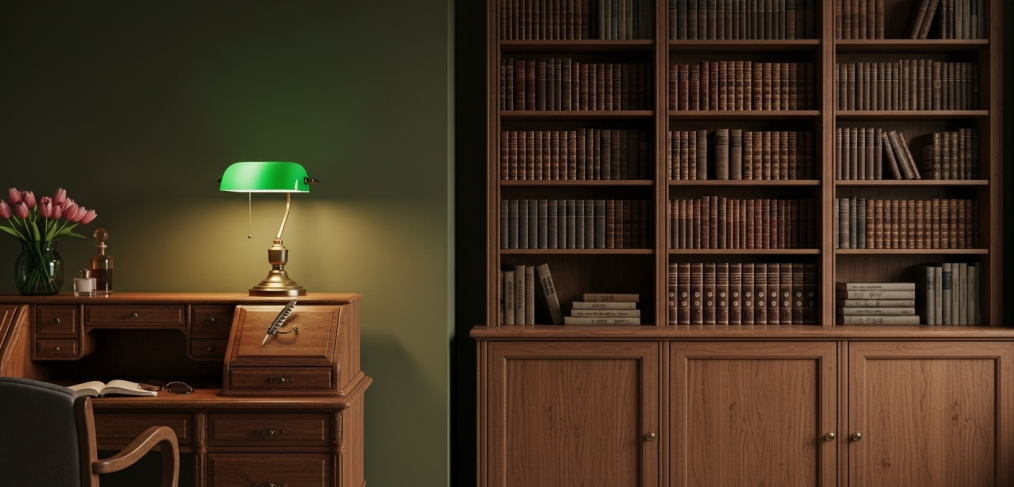 - Iluminación de trabajo: Una lámpara de escritorio es fundamental. Elige un modelo icónico, como una lámpara de banquero con tulipa de cristal verde o una de latón con brazo articulado. Su luz debe enfocarse directamente en tu zona de trabajo.