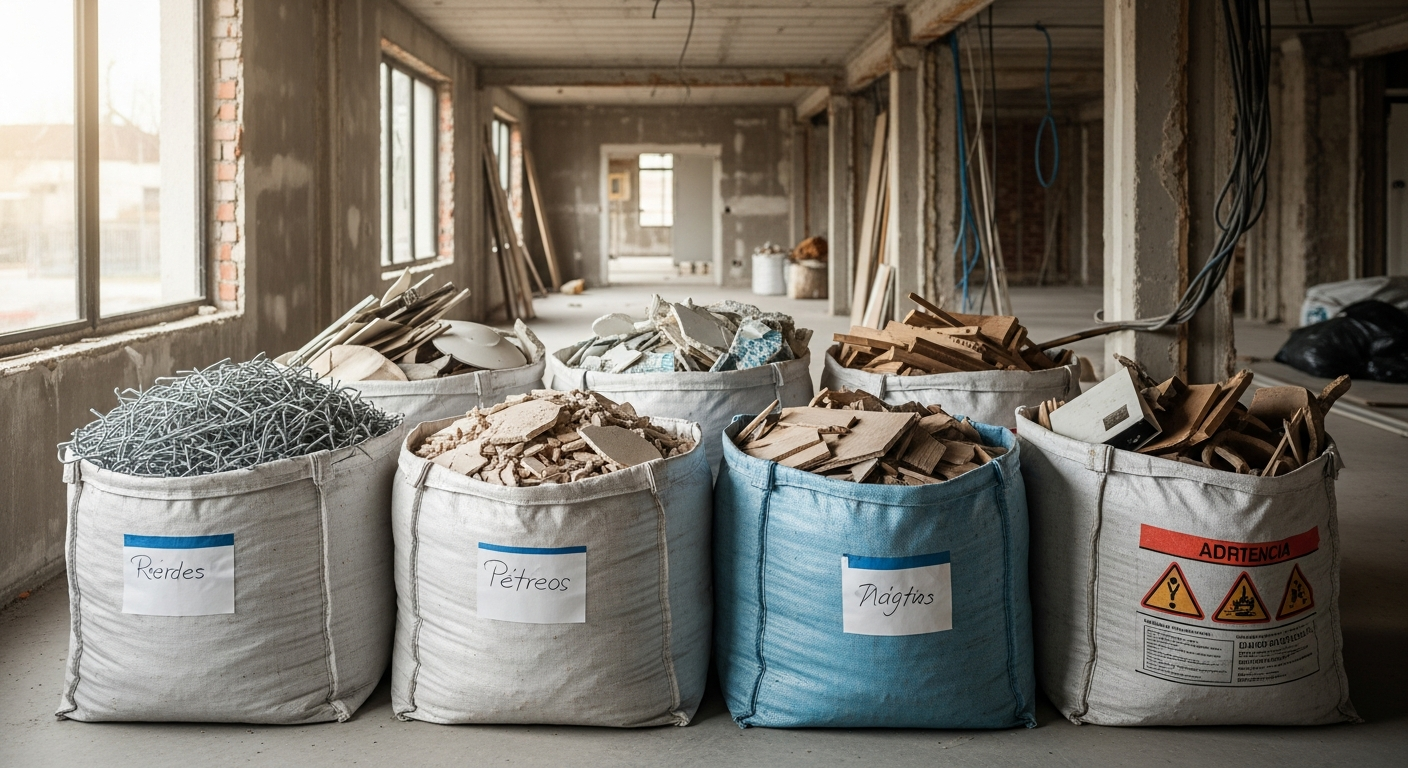 - Separación en Origen: La clave del éxito. En lugar de mezclar todo en un único contenedor, se habilitan diferentes recipientes o sacas en la obra para cada tipo de material. Una saca para escombros limpios (ladrillos, hormigón), otra para madera, otra para metales, etc. Esta simple acción facilita enormemente el reciclaje posterior y aumenta el valor de los residuos.