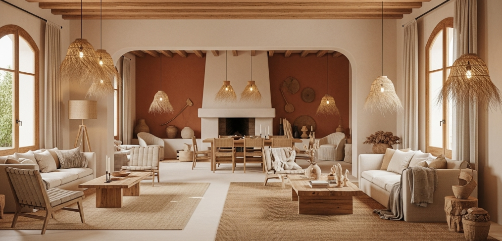 - Autenticidad y Calidez: Se priorizan los materiales en su estado más puro. La paleta de colores es eminentemente terrenal: tonos arcilla, beiges, arenas, blancos rotos y ocres que aportan una calidez inmediata y envolvente.