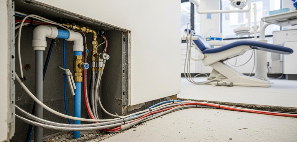 La instalación de fontanería en una clínica dental es infinitamente más compleja que la de una vivienda o un local comercial convencional. No se limita a llevar agua a los aseos; debe dar servicio a equipos altamente especializados. Cada sillón dental necesita su propia red de alimentación y evacuación.