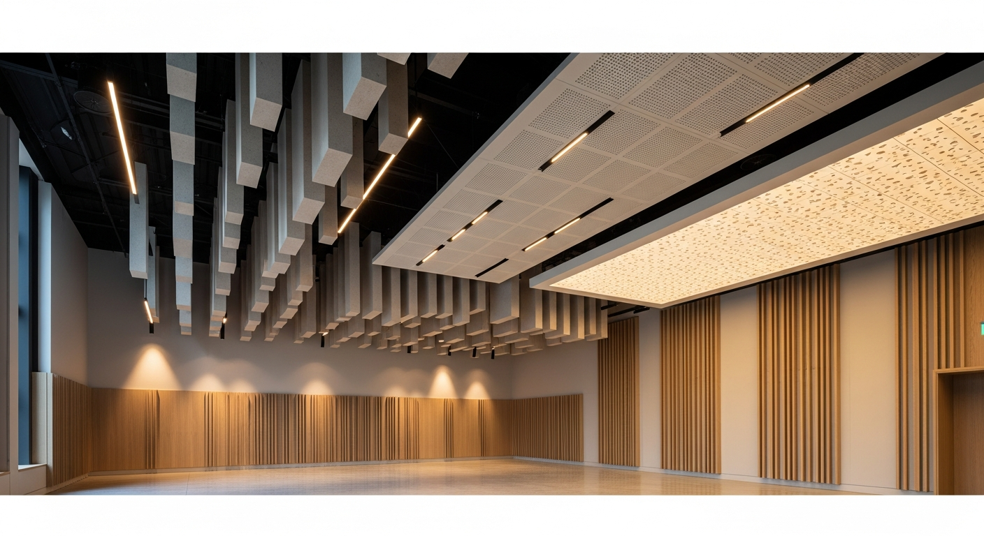 • Islas y baffles acústicos suspendidos: En locales donde no es posible o no se desea instalar un falso techo continuo, colgar elementos absorbentes es la mejor alternativa. Los baffles cuelgan verticalmente y las islas horizontalmente, interceptando el sonido de manera focalizada.